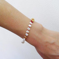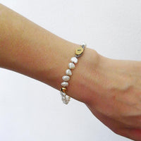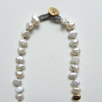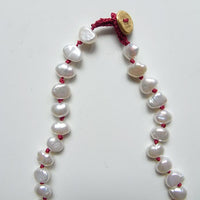 朝露という意味を持ちます。優しいぷっくりした朝露を思わせる優しいシルエットの淡水パールを、1粒ずつシルクのコードで結び目を作りながら繋ぎ、柔らかいシルエットを出しました。所々に配した淡水パールから実際に型をおこしたパーツが良いアクセントとなっています。