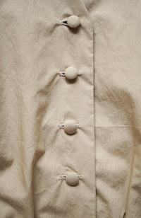 The shallow V-neck collar and rows of covered buttons give it an elegant look.