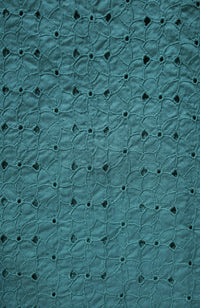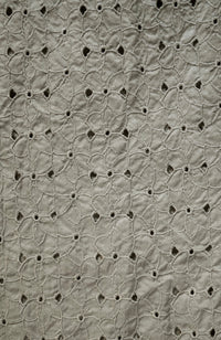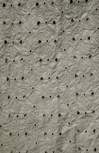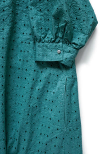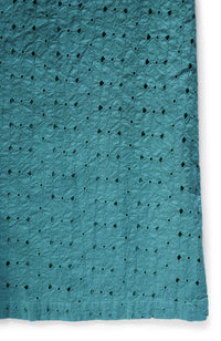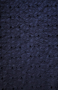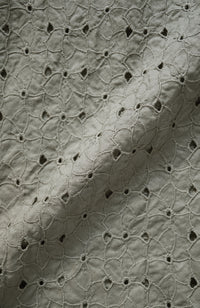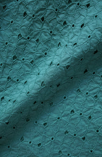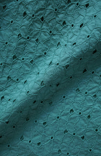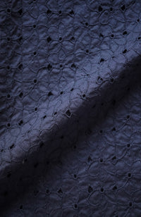 A luxurious all-over embroidered fabric with a boler (an embroidery technique in which holes are made in the fabric with a scalpel and sewn with thread) pattern is dyed after production.