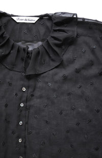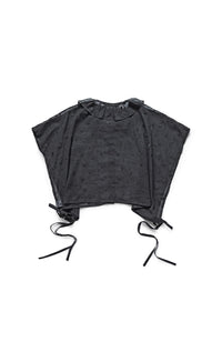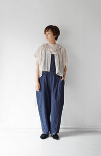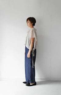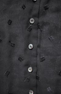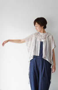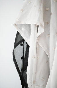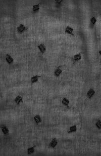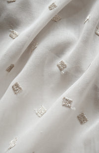 A thin voile with a subtle shimmering effect, embroidered with glitter thread. It has a sheer, crisp, cool feel, and is light and fluffy to wear.
