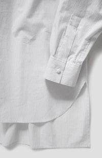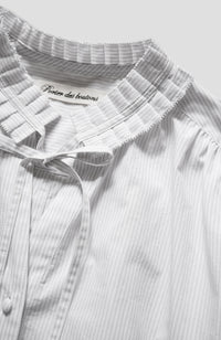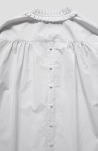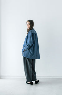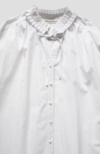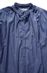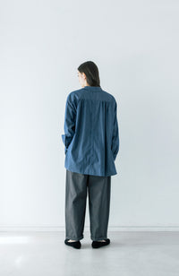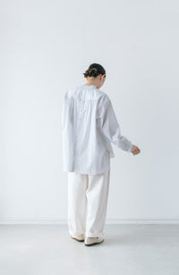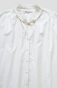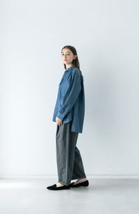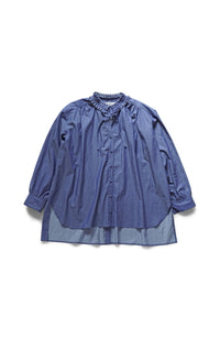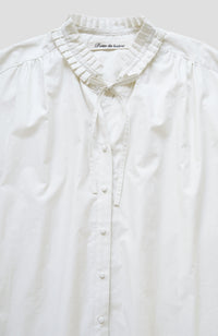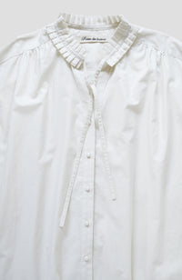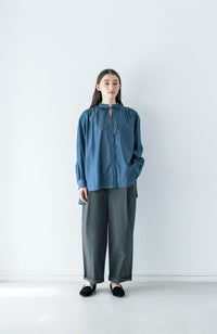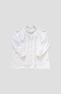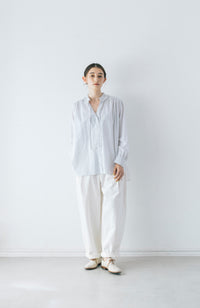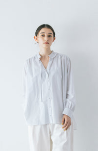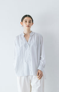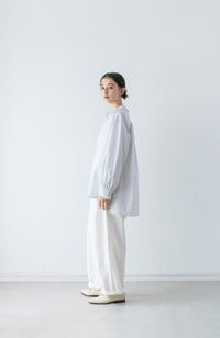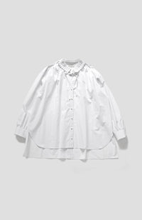 Tuck collar, pico cut embroidery on collar edge, collar ribbon, front and back lengths differ, front hem only rounded, slits on both sides, long sleeves