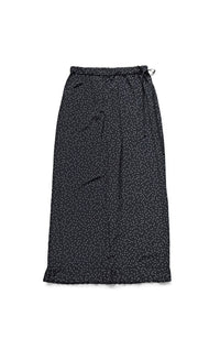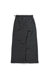 Elastic waistband; Cotton satin tape inside waistband, adjustable at left side; Back patch pocket; Pleated hem; Picot cut embroidery at the end of the pleats