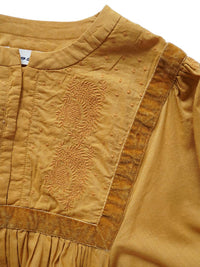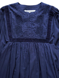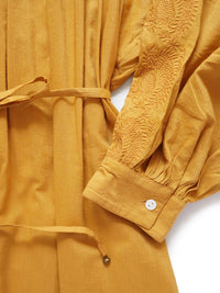 A caftan dress with plenty of embroidery on the front yoke and sleeves.