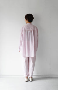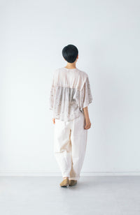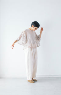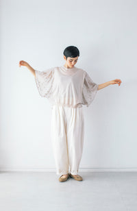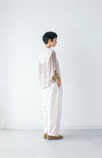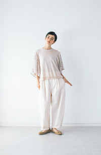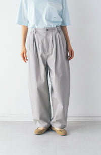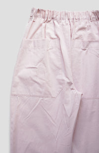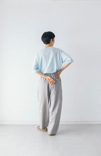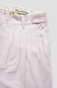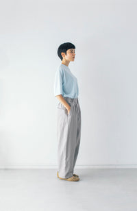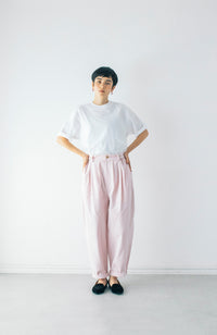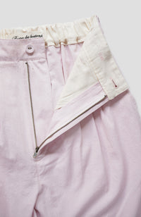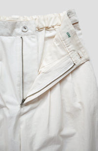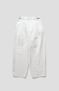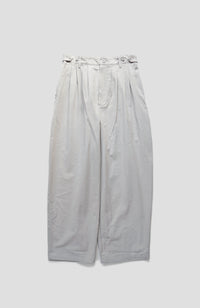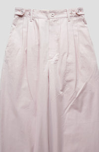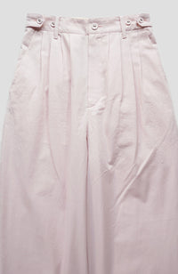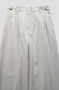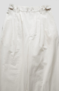 ・4 front tucks・Pockets on both sides・Elastic waist at back・Adjustable tabs on both sides of waist (2 covered buttons in same material)