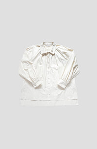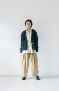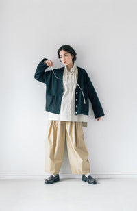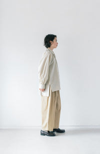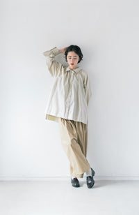 ・2-way collar (shirt collar/stand collar), with thin ribbon of same material ・Length differs between front and back ・Slits on both sides, triangular patch ・Raglan sleeves ・Long sleeves