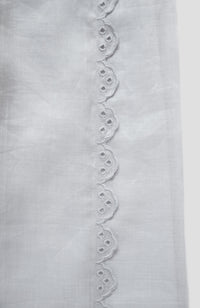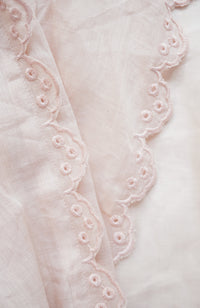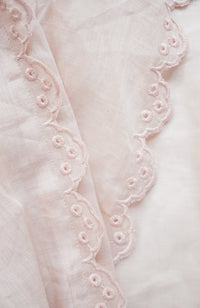 ボーラー(生地にメスで穴を開け、糸でかがる刺繍技法)とスカラップの刺繍を施しました